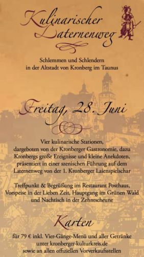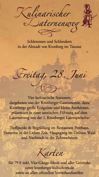 Die 1. Kronberger Laienspielschar lässt entlang des Kronberger Laternenweges Geschichte lebendig werden. Eine szenische Führung entführt Sie in die Zeit der raufenden Ritter und der streitenden Prälaten und begleitet Sie durch die Geschichte Kronbergs.