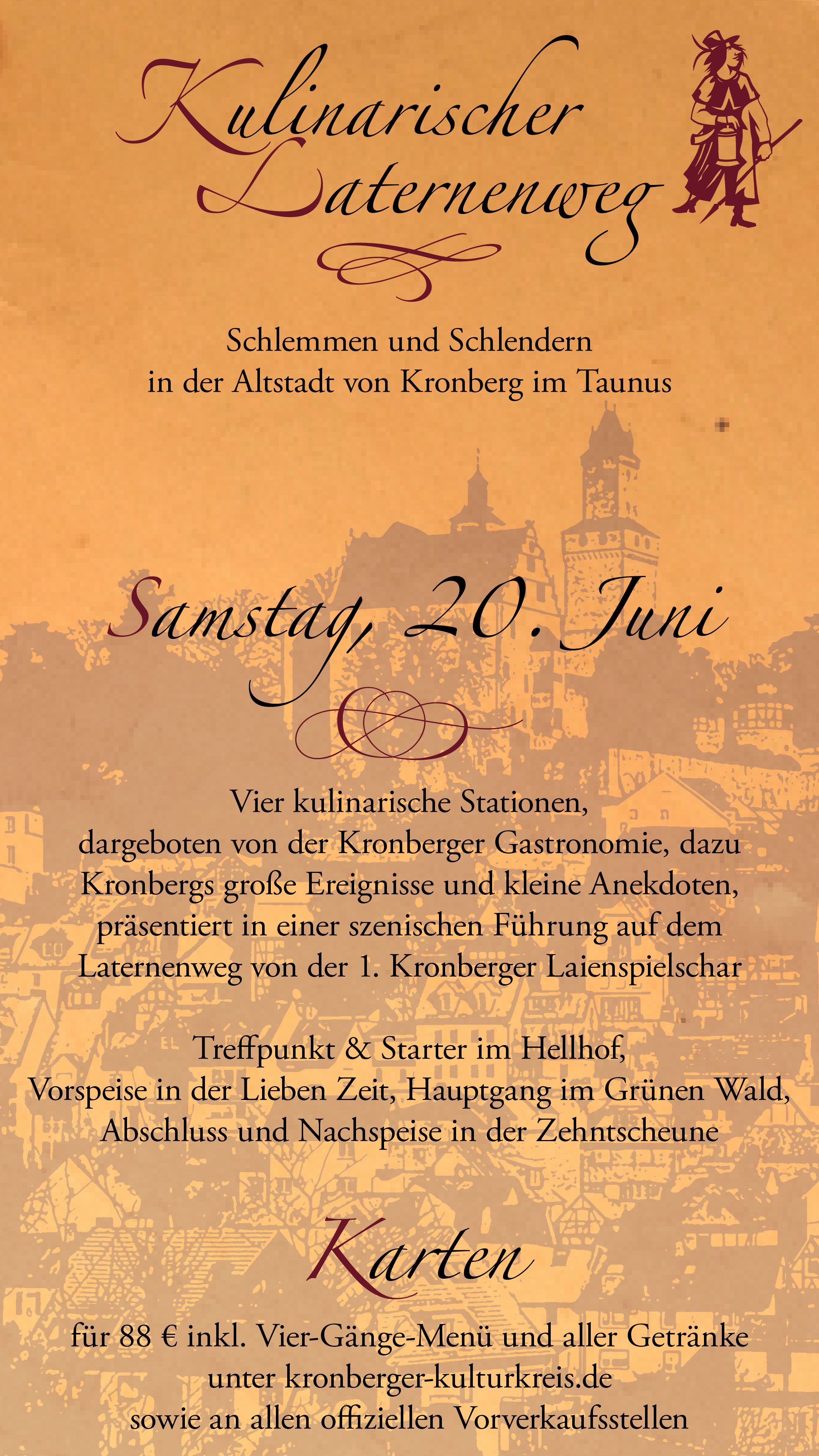 Die 1. Kronberger Laienspielschar lässt entlang des Kronberger Laternenweges Geschichte lebendig werden. Eine szenische Führung entführt Sie in die Zeit der raufenden Ritter und der streitenden Prälaten und begleitet Sie durch die Geschichte Kronbergs.