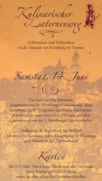 Die 1. Kronberger Laienspielschar lässt entlang des Kronberger Laternenweges Geschichte lebendig werden. Eine szenische Führung entführt Sie in die Zeit der raufenden Ritter und der streitenden Prälaten und begleitet Sie durch die Geschichte Kronbergs.